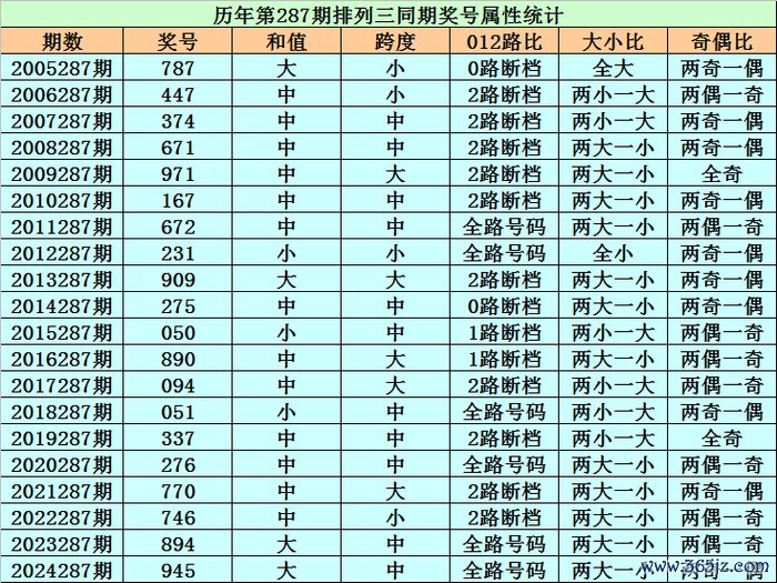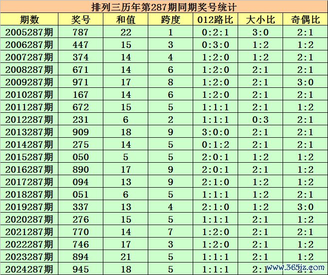 历史上第2025287期罗列三已开出20期奖号了,积年同时奖号永别为:787、447、374、671、971、167、672、231、909、275、050、890、094、051、337、276、770、746、894、945,防卫统计见下表: